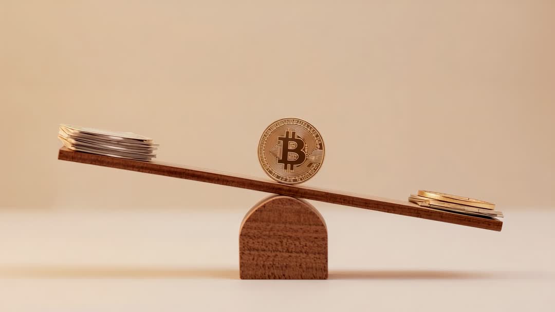 AI Generated Image. Video showing Bitcoin coin balancing on wooden seesaw pivoting on curved fulcrum, with uneven coin stacks tilting plank. Warm neutral background creating minimal composition and soft shadowing. Visual emphasizing contrast between cryptocurrency and traditional coins, suggesting volatility, value tension, market comparison. Use for financial news segments, market analysis videos, fintech promos, blog headers, presentation intros, social media thumbnails, educational explainers about portfolio risk and asset allocation. Frame composing central subject with ample negative space for headline overlay, supporting title animations and motion graphics. Suitable for 16:9 widescreen, adaptable to vertical crop for mobile apps, and useful as conceptual clip for advertising, investor relations, and economic storytelling.