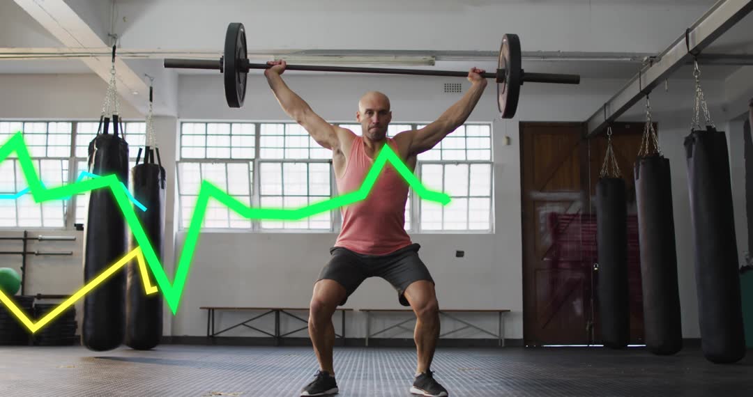 Video showing bald athlete performing overhead squat while lifting barbell, neon performance lines overlaying frame to suggest strength metrics and progress tracking. Gym interior featuring punching bags and bench highlighting training environment. Footage conveying explosive power, focused technique, and athletic conditioning. Serving fitness campaign videos, trainer tutorials, athlete performance breakdowns. Enhancing sports analytics presentations and data-driven marketing with graph overlay. Powering gym promotions, CrossFit advertising, workout app splash screens, social media reels. Using still frames for editorial articles on strength training, technique coaching, and athlete profiling.