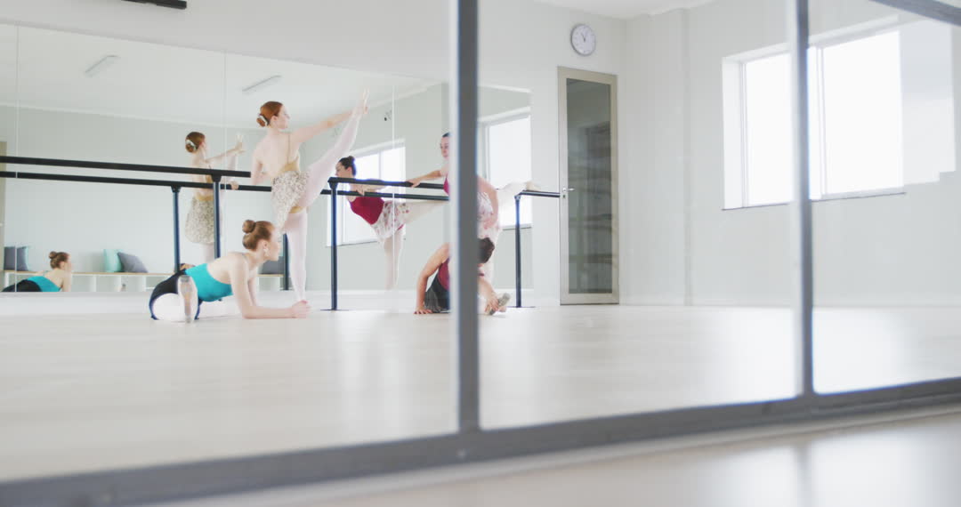 Several ballet dancers engage in stretching exercises using a barre in a bright, airy dance studio. The mirrored walls reflect their movements as they practice splits and other dance techniques, emphasizing grace and flexibility. This could be useful for promoting dance schools, ballet classes, or illustrating articles related to performing arts and fitness.