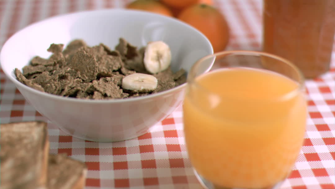 This video shows banana slices falling into a bowl of bran cereal, emphasizing a nutritious and energy-boosting breakfast setting. A glass of orange juice is placed prominently, adding visual balance and reinforcing a healthy lifestyle theme. Perfect for content promoting balanced breakfasts, health-based blogs, or food advertisements targeting healthy breakfast choices.