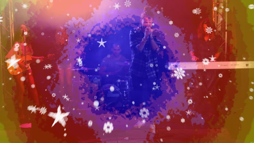 Illustrates a live music performance with a digital overlay of festive snowflakes and patterns. Ideal for promoting arts and entertainment events, holiday music concerts, or digital marketing campaigns related to seasonal celebrations. Use in newsletters, event flyers, or creative advertisements dedicated to winter festivities and musical performances.