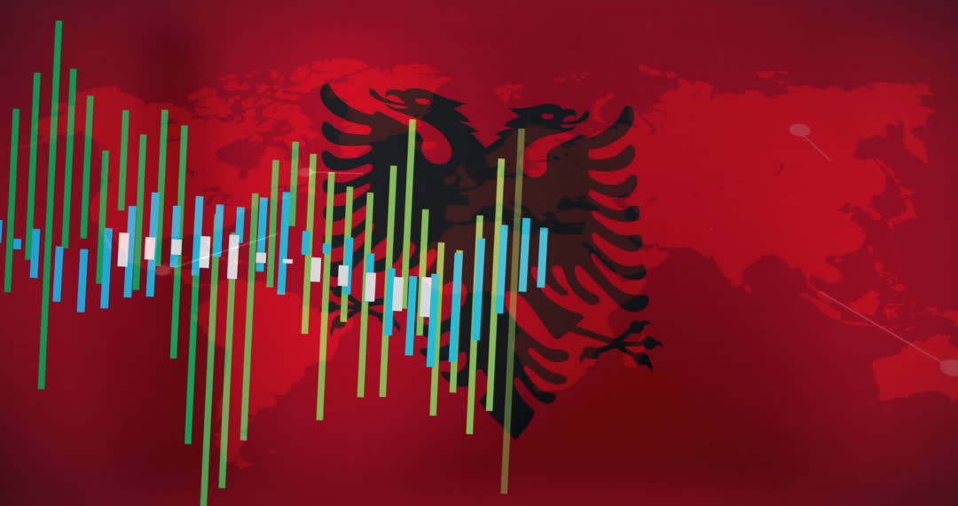 - Bar Chart Analysis Overlapping Albanian Flag on World Map