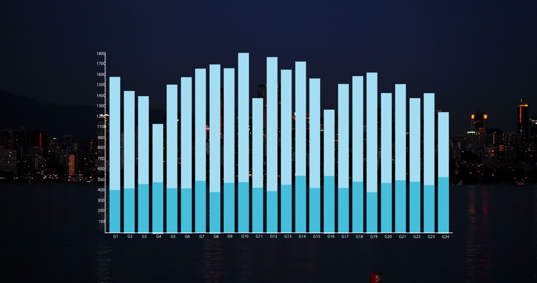 Bar graph animation showcasing data processing over urban cityscape during night offers powerful visual for presentations, reports, and digital platforms focused on business strategy, analytics, and technological advancement across global markets. Use this animation to demonstrate statistical reviews or engage tech-savvy audiences with visually assimilating digital and urban growth.