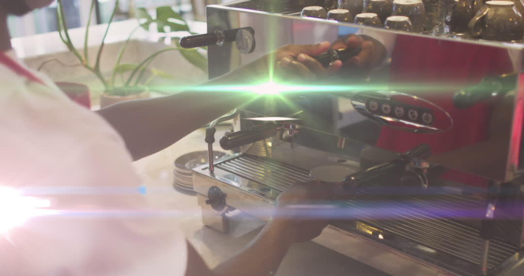 Biracial barista preparing a fresh cup of coffee using a modern espresso machine while soft digital light effects add a stylized flair to the scene. Ideal for using in articles about innovative coffee shop practices, barista training and artistry, or coffee culture and trends.