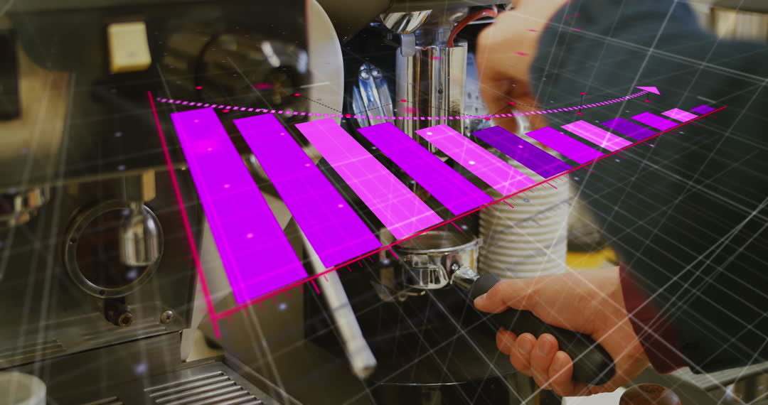 Cropped hands of a barista preparing coffee are creatively overlaid with animated growth graphs, highlighting the intersection of artisan coffee crafting with financial and business concepts such as growth and success. Ideal for use in articles about the coffee industry's impact on business and finance or when illustrating economic trends in niche markets.