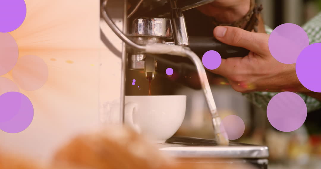 Scene captures barista pulling espresso shot with modern coffee machine, enhanced by creative animation of digitally generated purple dots. Ideal for videos involving barista skills, modern cafes, artistic presentations, digital artistic effects, or promotional content for coffee shop events.
