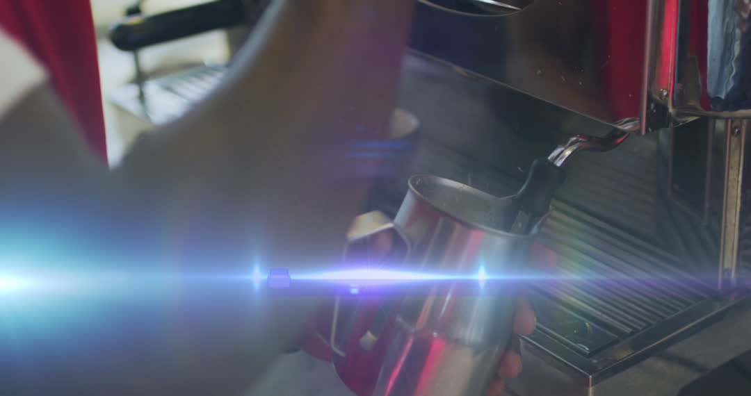 A skilled barista skillfully frothing milk beneath an espresso machine with captivating light effects superimposed across the scene. This representation underscores the craftsmanship behind preparing beverages, providing a unique visual on the aesthetic aspects of a gastronomic profession. Useful for promoting a cafe environment, bartender training material, or marketing creative coffee art and barista skill courses.