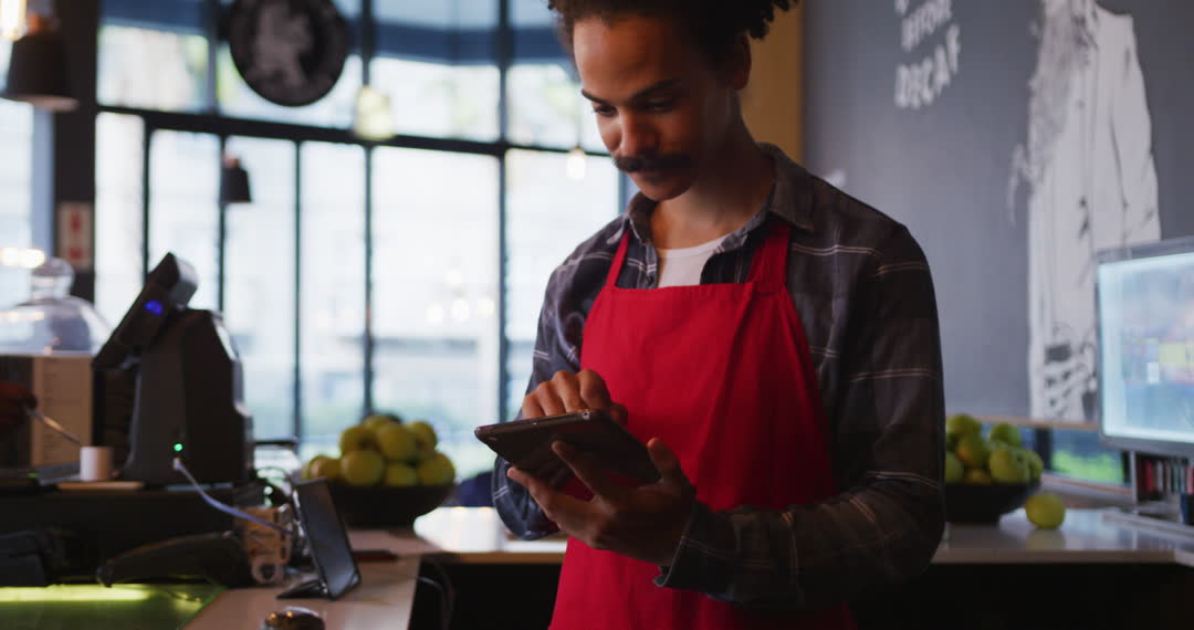 - Barista in Red Apron Using Digital Tablet in Busy Cafe