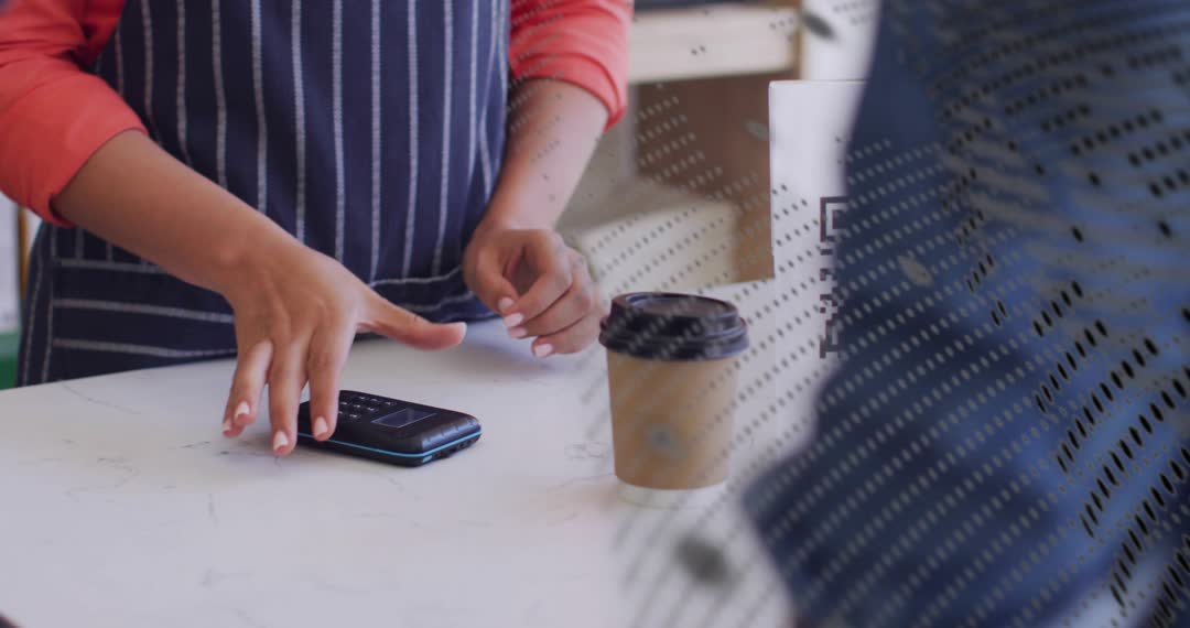 Video showing barista placing paper cup next to contactless card reader while customer tapping smartphone to complete QR payment. Foreground featuring dotted glass creating modern graphic pattern and adding visual depth. Close-up focusing on hands, striped apron, and countertop to convey fast casual hospitality and cashless transaction. Useful for fintech marketing, mobile wallet tutorials, cafe branding, point-of-sale demonstrations, retail training videos, social media ads, and blog headers about digital payments. Ideal for use in website hero banners, explainer videos, investor pitch decks, and on-screen overlays in e-learning modules.