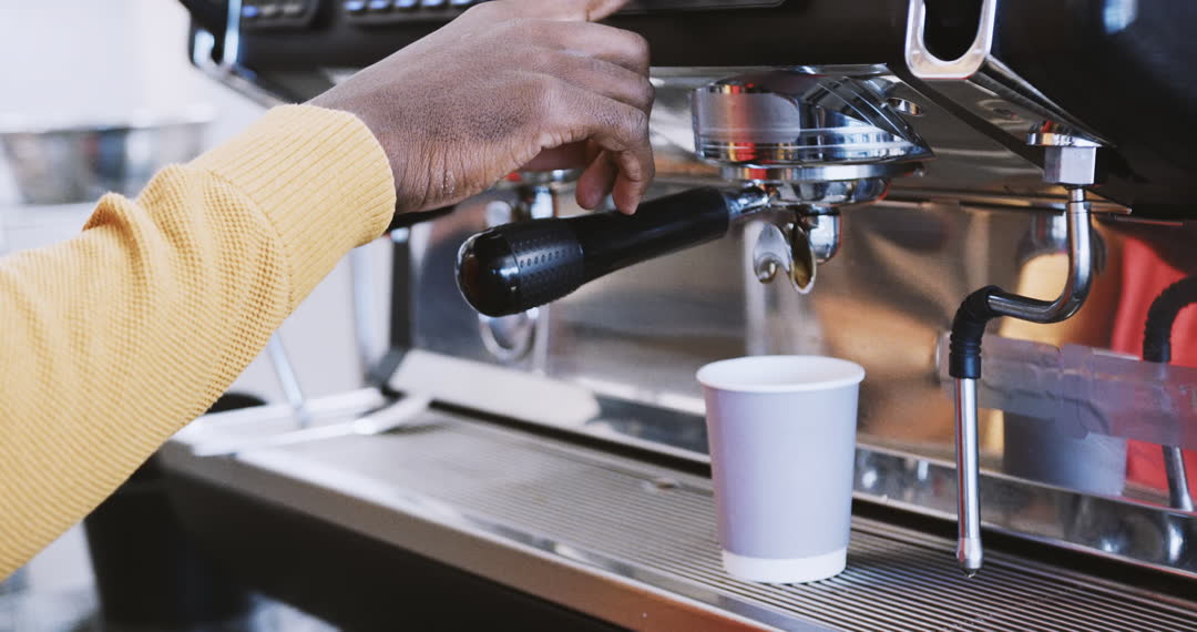 Barista wearing yellow sleeve operating an espresso machine while preparing coffee in a cafe. Suitable for illustrating cafe environment, coffee preparation processes, manual artisanship in coffee brewing, or promoting coffee shop products.
