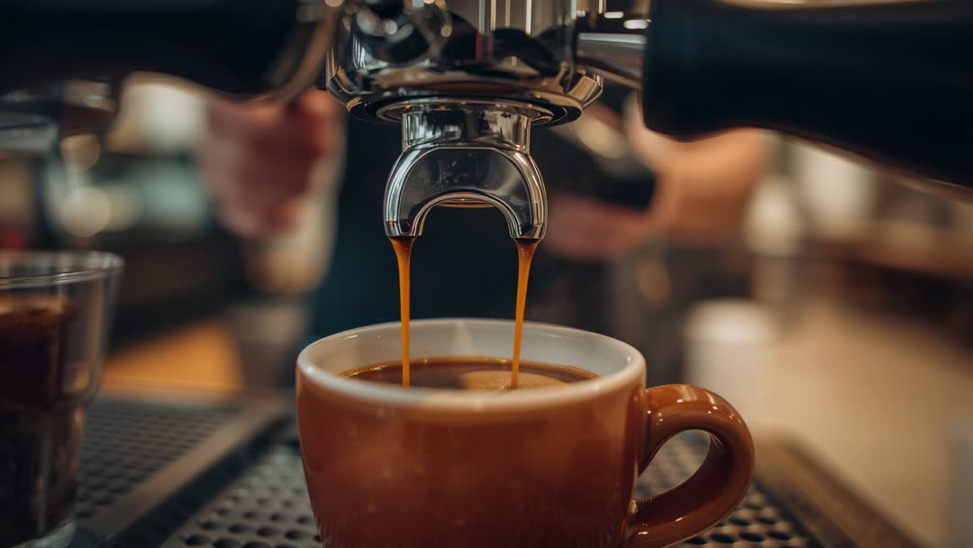 AI Generated Video. Close-up video showing barista pulling double espresso shot into brown ceramic cup. Rich crema forming as espresso pouring from double-spout portafilter, creating smooth twin streams. Background featuring blurred barista and cafe bokeh, adding warm, inviting ambience. Useful for coffee shop marketing, menu video loops, social media reels, website hero banners, packaging and product ads, barista training clips, editorial content about specialty coffee, and lifestyle morning routine features. Recommend using slow motion or 60fps to emphasize crema flow, applying warm color grade and shallow depth of field to enhance focus, and creating loopable short clip for digital signage and social media. Suggest overlaying simple text or logo for branding, using close crop for hero banner or wider crop to include barista interaction and counter environment.