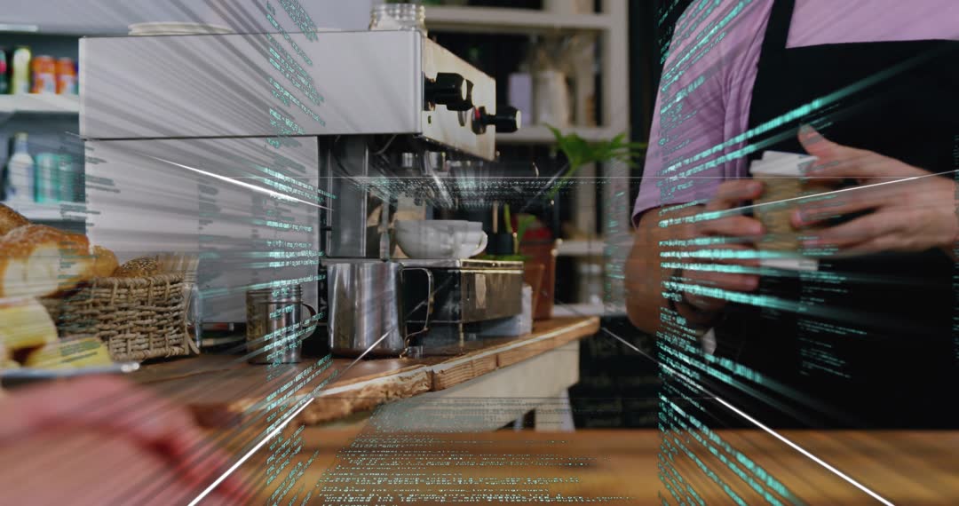 Barista Serving Coffee with Streaming Technology Overlay Video