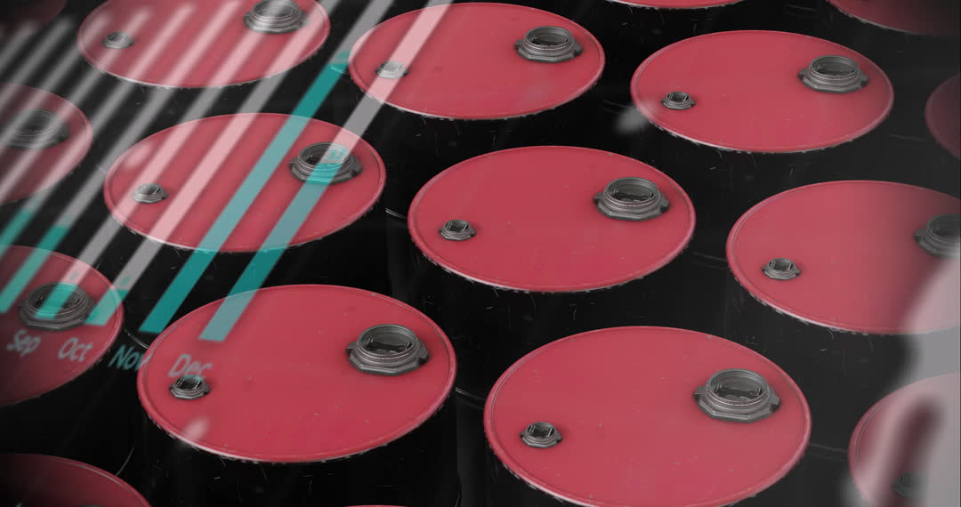 Image depicts barrels overlaid with a graph animation, symbolizing data processing in global shipping. Useful for illustrating articles on economic trends, data management, import-export business strategies, or technological advancements in logistics.