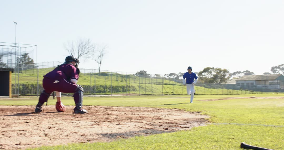 - Baseball Player Sprinting Towards Catcher on Sunny Day