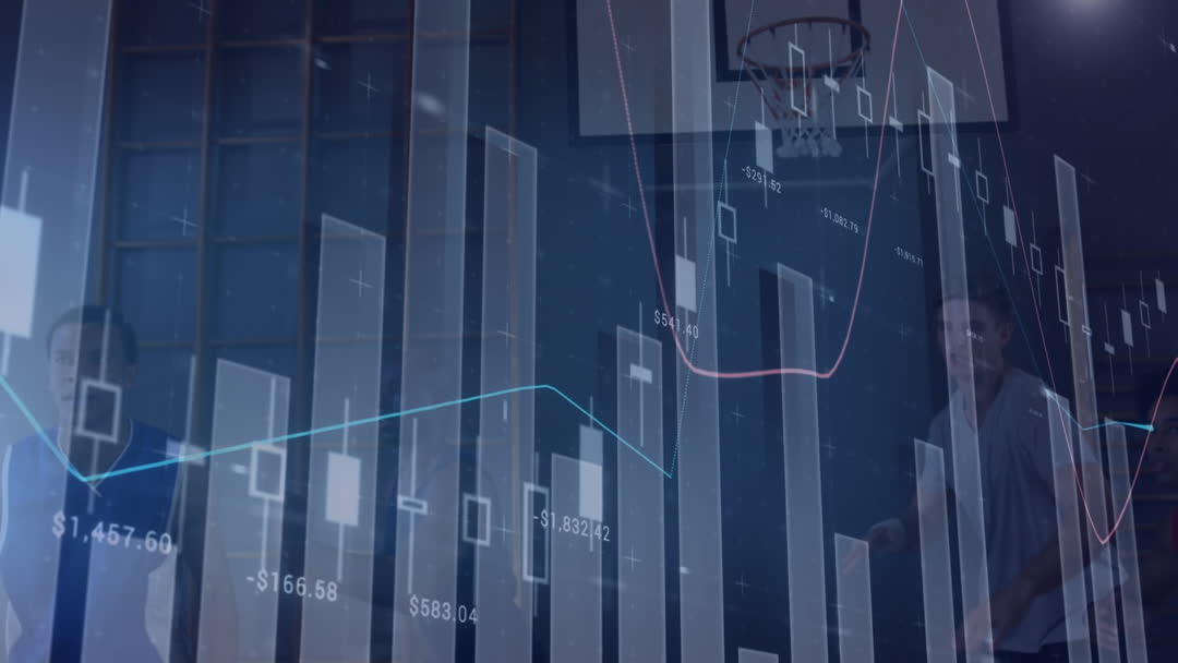 Overlay combines basketball action with financial data graphs, symbolizing integration of sports and technology. Perfect for illustrating digital analytics in sports industries or depicting data-driven business strategies in athletic contexts.