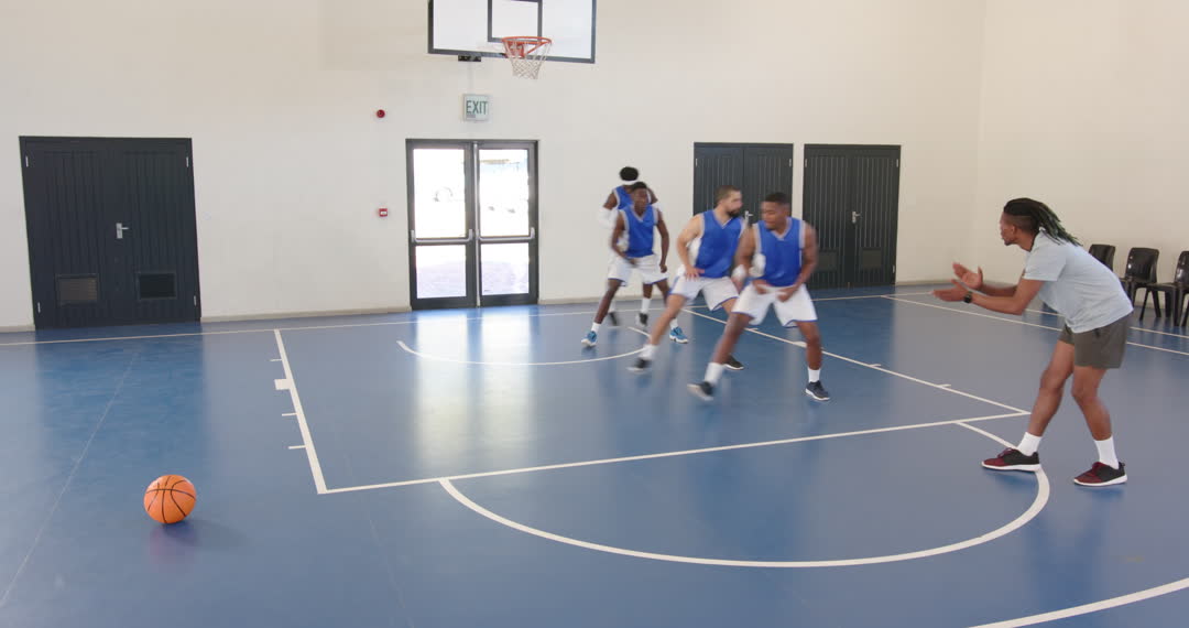 - Basketball Coach Guiding Players Through Defensive Drills in Gym