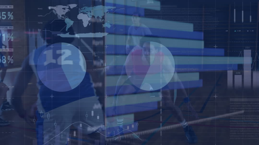 This stock photo captures a basketball game overlaid with dynamic data and statistical graphics. The blending of sports action with digital graphics illustrates concepts of sports analytics, business strategy, and technological integration. This video can be used for promoting sports analytics apps, financial services highlighting data use in sports, and projects that combine sports with cutting-edge technology.