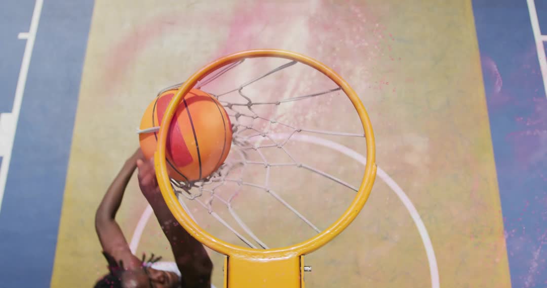 Dynamic top-down view captures energetic moment basketball player dunks ball, highlighting athleticism and competition. Ideal for promoting sports events, showcasing skill development, or emphasizing team spirit and motivation in fitness and sports-related multimedia.