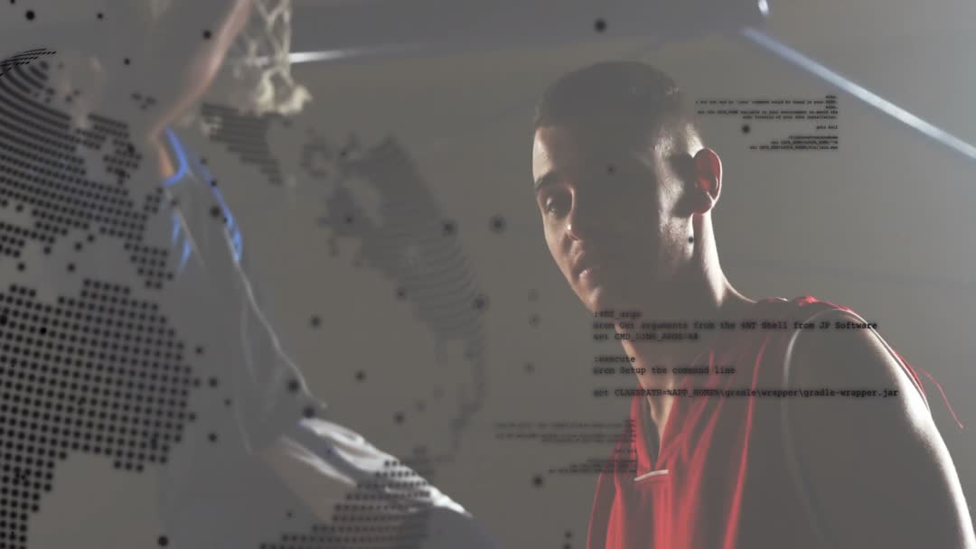 The video showcases a basketball player in a red jersey with an overlay of digital information set against a world map background. It elegantly merges athleticism with technology, drawing associations between global connectivity and sports. The digital elements suggest themes of data analytics, growth in sports technology, and a futuristic perspective on athletic industries. Ideal for use in sports technology articles, global sports presentations, or campaigns highlighting digital advancements in athletic training.