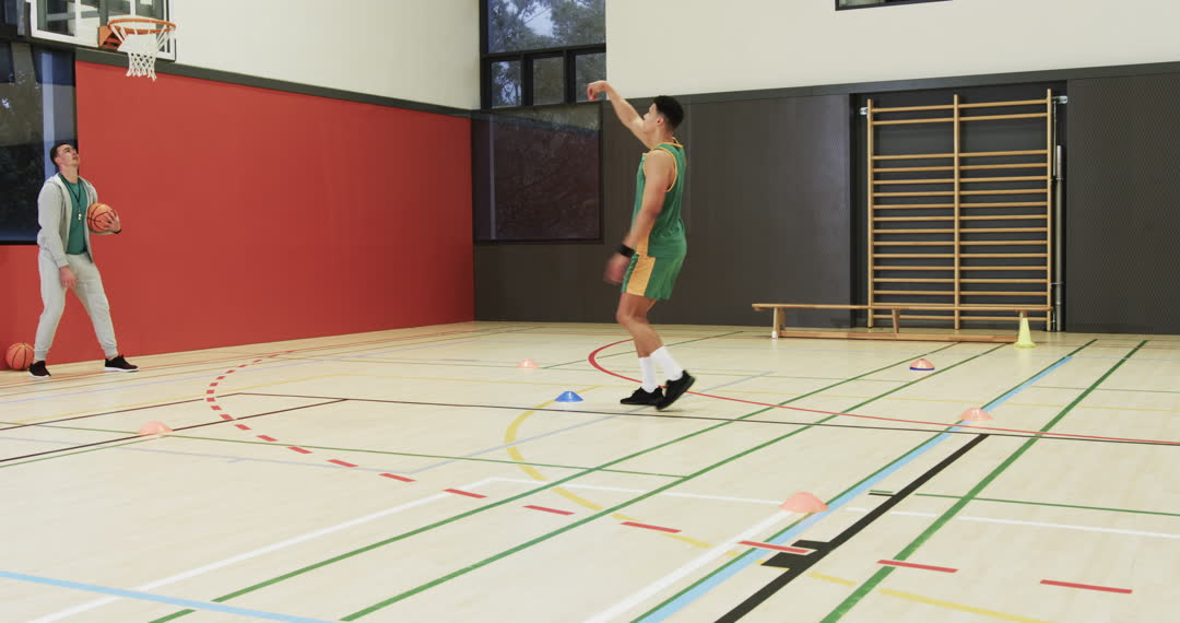 - Basketball Player Shooting Practice with Coach in Gymnasium