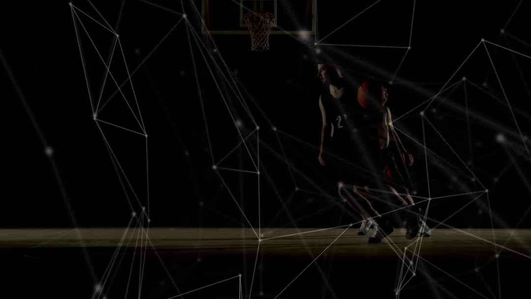 The video showcases athletes engaged in a basketball game with a digital network overlay highlighting the connection between sports and technology. Ideal for illustrating digital innovations in sports training, strategic gameplay analysis, athletic competitions, or teamwork dynamics in tech-related presentations or sports technology markets.