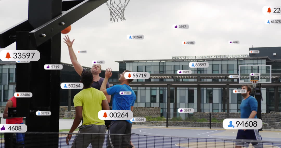 This scene depicts basketball players showcasing skills on an outdoor court. Overlaid graphics of digital data suggest themes of social media interaction and data processing in sports. Ideal for tech companies, sports analysts, and educational materials exploring technology in athletics. Great for illustrating how data analytics integrate with physical activities.