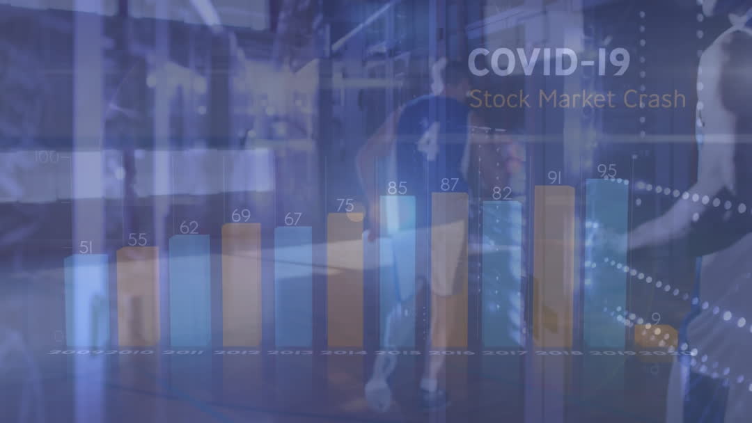 Visual blend of athletes playing basketball combined with animated financial data overlay signifies impact of COVID-19 on sports economy. Practical for illustrating concepts of multidimensional interaction between sports and finance, technological disruption in sports industries, or visualizing complex digital data scenarios.