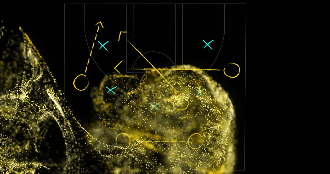Dynamic representation of basketball strategies with player movements and tactical diagrams over an abstract digital background. Useful for sports analysis, coaching presentations, athletic training materials, team strategy planning, or visually engaging sports content.
