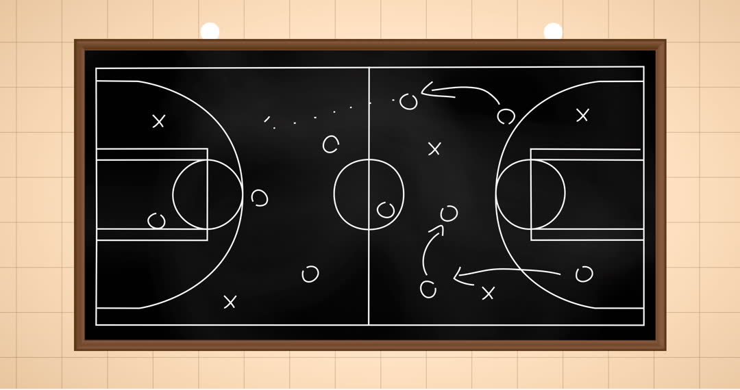 Depicts a basketball court drawn on a chalkboard with player positions and strategy markings. Useful for sports education, coaching material, or illustrating team strategies in presentations or articles on sports techniques.