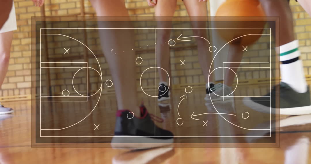 Dynamic overlay of basketball strategy diagram over young athletes actively practicing on an indoor court embodies teamwork, coordination, and the importance of strategic play in sports. This visual can be used to highlight coaching techniques, player training, and teamwork activities. Ideal for sports marketing, educational materials, or coaching simulation visuals.