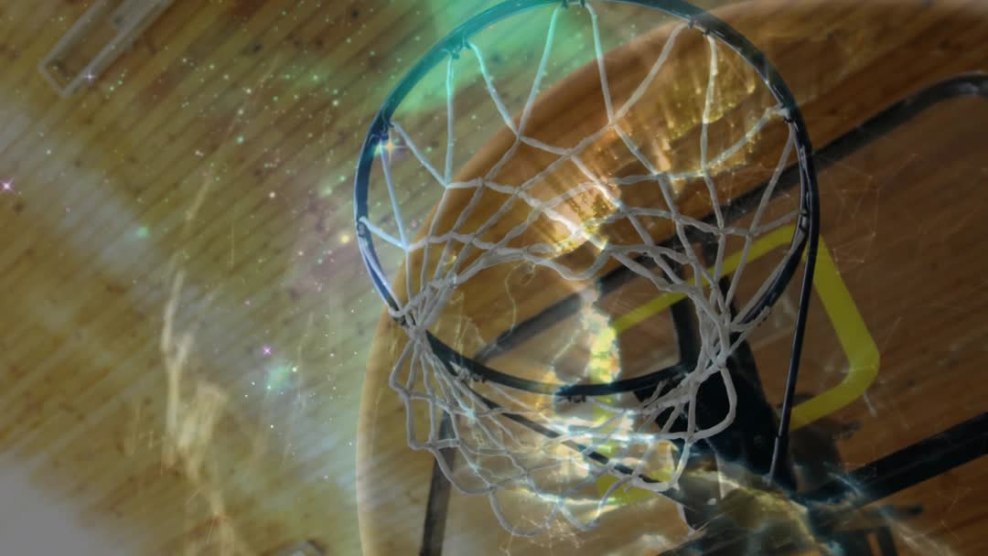 - Basketball swishing through hoop with glowing nebula light trails and hardwood reflections