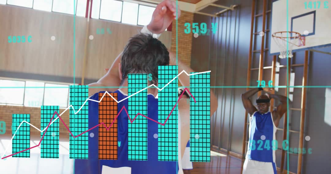 Frame showing player number 7 stretching arms while animated bar and line charts overlay court, visualizing performance metrics and biometric data. Camera zooming in on rear view of player, teammates warming up in background, basket and gym equipment visible. Graphic elements displaying rising bars, trend lines, currency-style labels, grid overlay, conveying real-time analytics and sports science feedback. Use for sports technology demos, team training videos, wearable sensor marketing, coaching presentations, fitness app previews, broadcast openers, corporate pitches for analytics platforms, or social media clips highlighting data-driven performance. Provide option for voiceover about training insights, motion tracking demo, or stat-driven montage. Color palette and motion-friendly composition supporting text overlays, lower thirds, and logo placement.