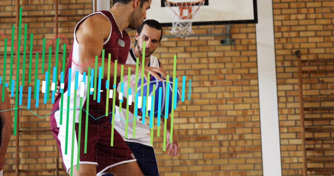 Basketball players seen practicing in gym, with data overlay displaying sports analytics. Ideal for use in showcasing advancements in sports technology, training strategies, and the importance of data in athletics. Useful for promotional content on player performance, teamwork, or active lifestyle products aimed at athletes and coaches.