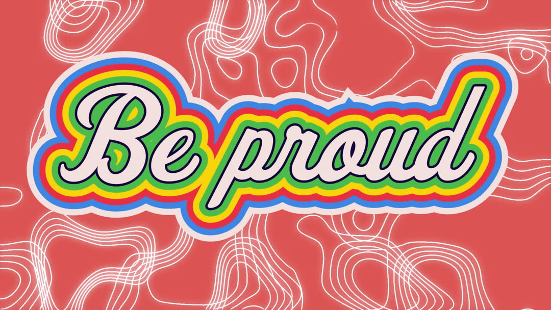 This video features vibrant 'Be proud' text with a rainbow design set against a dynamic line pattern on a red background. It is ideal for social media posts that inspire confidence or positivity and can also be used for digital marketing campaigns or posters that promote self-expression and encouragement.