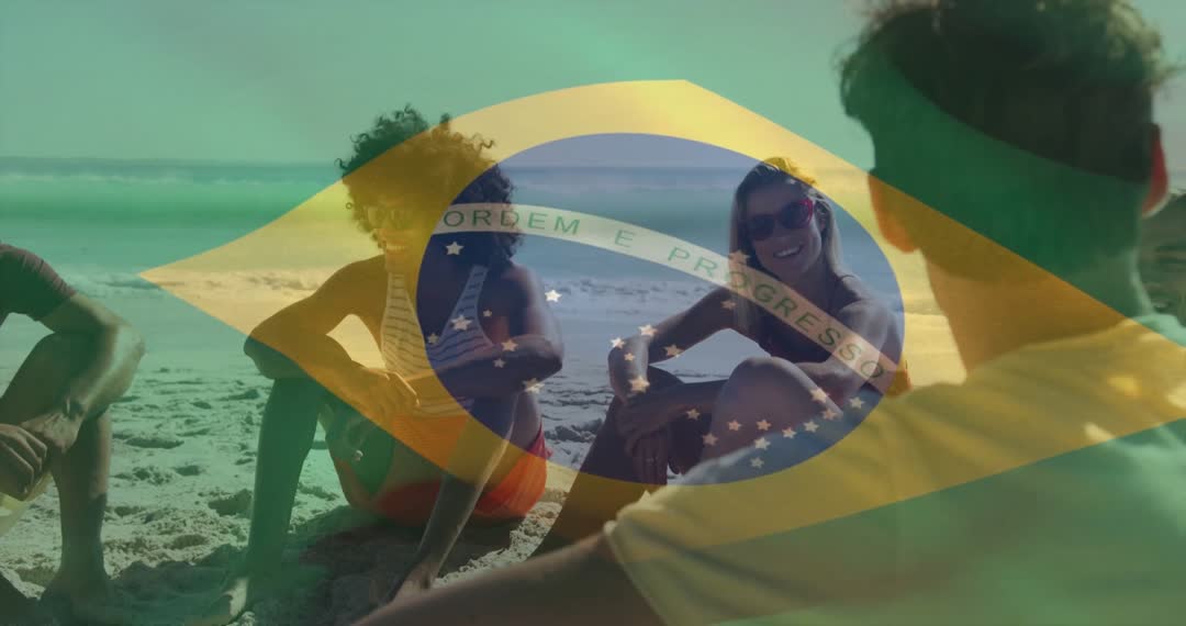 An overlay of the Brazilian flag is seen above a group relaxing by the sandy beach, offering a vibrant iteration of summer and travel themes. This visual depicts a leisure experience common in Brazil's iconic tropical settings, making it suitable for travel guides, promotional tourism content, and cultural festivities.