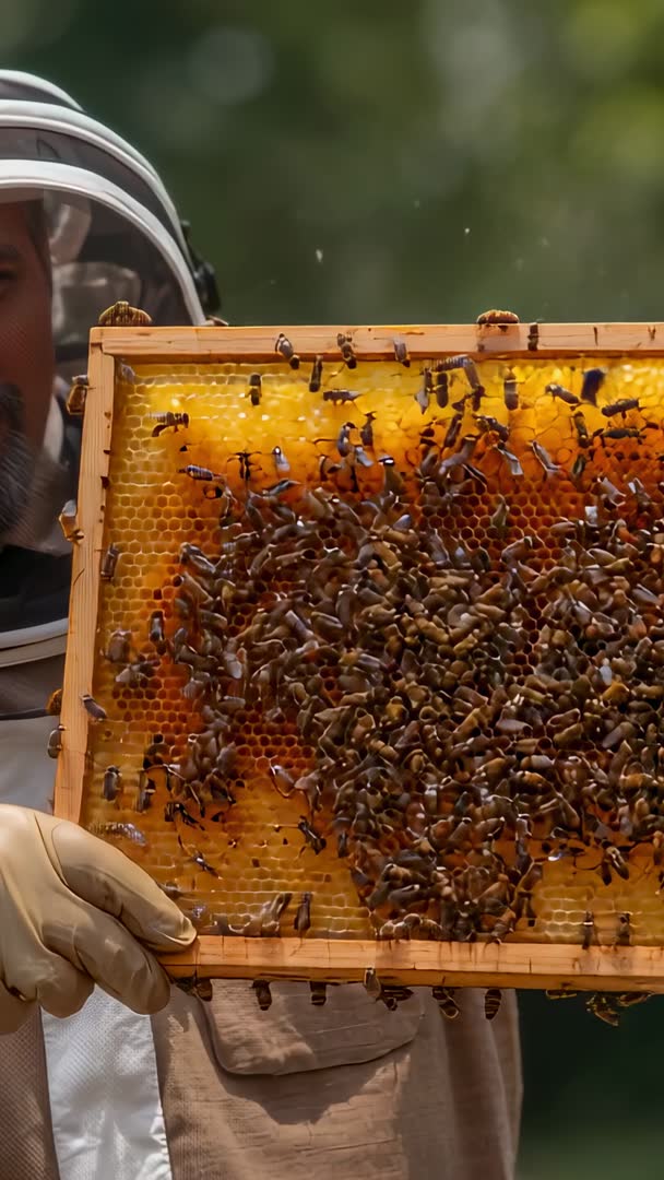 - Beekeeper Lifting Honeycomb Frame Inspecting Bee Colony in Sunlit Apiary | Vertical Video