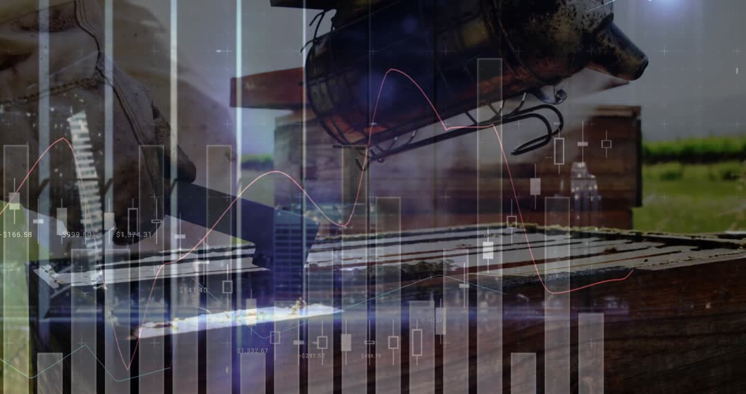 Creative visual device blending agricultural beekeeping scene with financial market analysis. Shows diverse connections between natural resource management and investment. Suitable for illustrating content related to agricultural investment trends, influencing farming on stock markets, or modernizing rural industries with technology.
