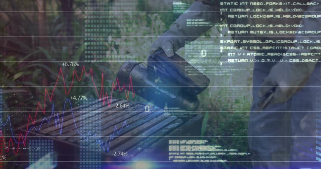 Beekeeper is engaging with hive box, emphasizing integration of technology in agriculture through displayed graphs and codes. This depiction showcases combination of traditional beekeeping and modern data analysis, inviting potential uses in presentations about sustainable farming, technological innovations in agriculture, and effective apiary management. Keywords assist in highlighting agricultural efficiency and tech synergy for ecological storytellers.