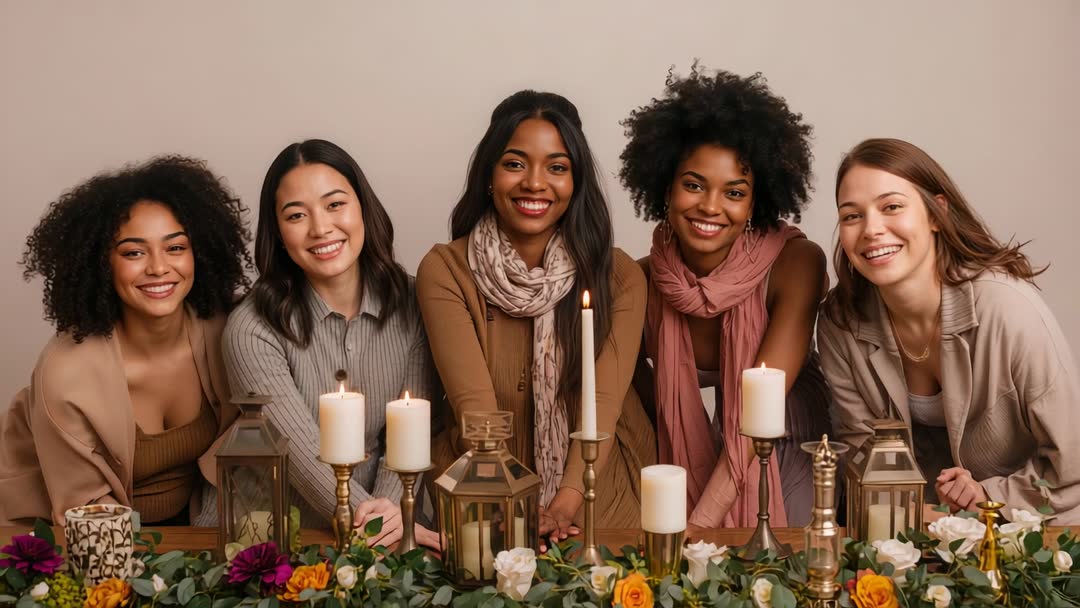AI Generated Video. Video showing five women leaning toward camera and smiling while adjusting pose around candlelit table decorated with floral garland, lanterns, and brass candlesticks. Scene conveying warm, cozy mood with natural expressions, soft warm lighting, and neutral wardrobe tones. Use for lifestyle and friendship campaigns, holiday or event promotion, social media reels, website banners, and editorial features highlighting community, togetherness, and inclusive gatherings. Suggestions for edits: cropping for vertical formats, slowing footage to emphasize candle flicker, applying warm color grade, adding soft ambient music for mood, and creating close-up cuts for product or detail focus. Perfect for commercial advertising, blog headers, brand storytelling, hospitality and floristry portfolios.
