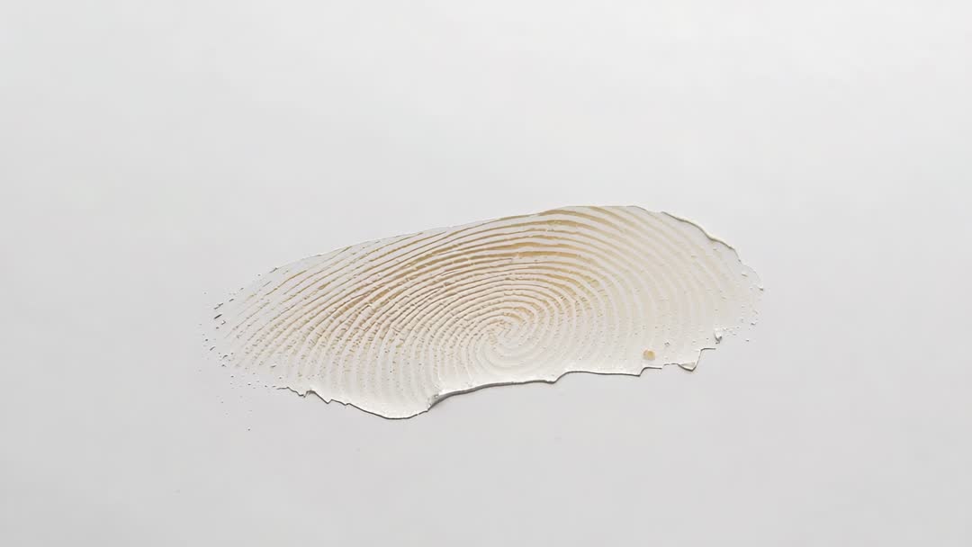 - Beige fingerprint liquid smear forming concentric ridges on white surface in slow motion