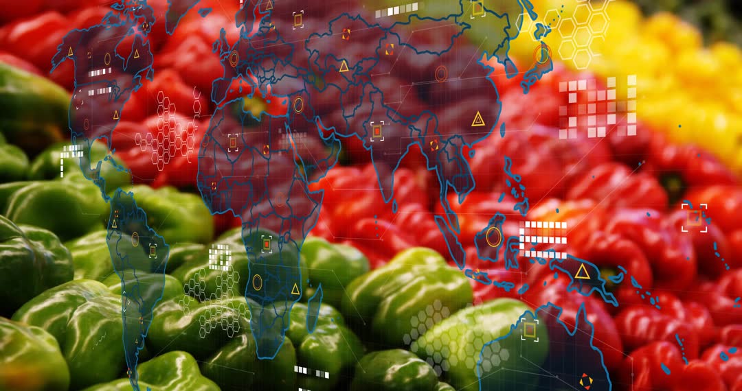 Image shows colorful bell peppers overlaid with digital grids and a world map, representing agricultural data analytics trends. Visual gives insight into technological integration in farming and produce management. Suitable for media on modern agriculture, eco-friendly solutions, technology in food production, farming innovations, or global food supply chain.