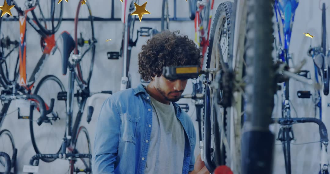 Bicycle mechanic in bustling workshop fine-tuning bicycle tire, ensuring it spins flawlessly. Surrounded by various bicycles and essential tools, capturing the profession's dedication and meticulous nature. Ideal for content focusing on mechanical skills, cycling lifestyles, or urban transportation.
