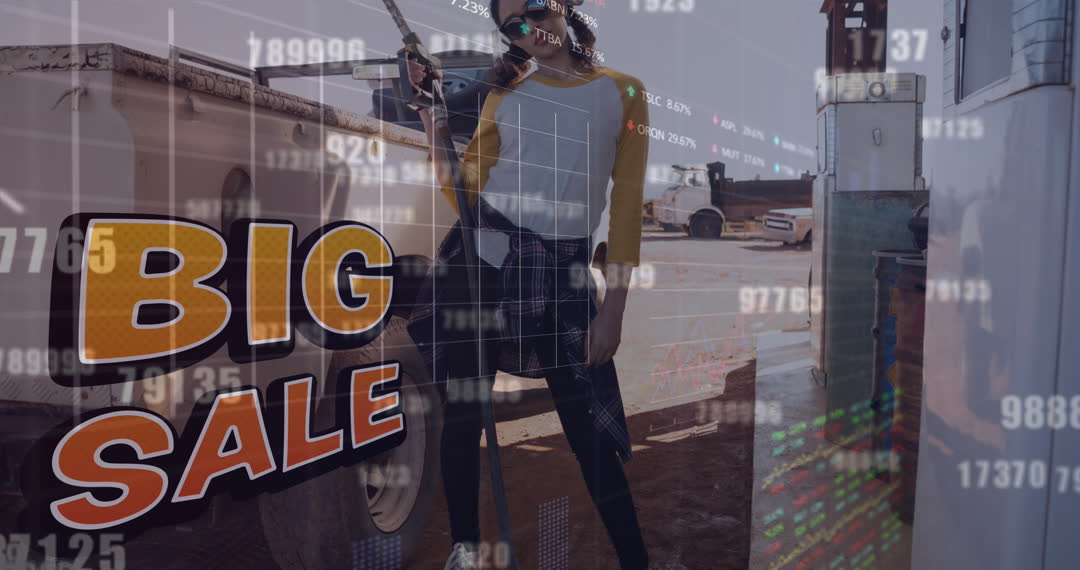 Image presents 'Big Sale' promotion with elements of finance data overlay while a woman fuels car. Visually captures motif interaction between economics and transportation. Suitable for promotional materials, automotive industry marketing, or financial analysis themes.