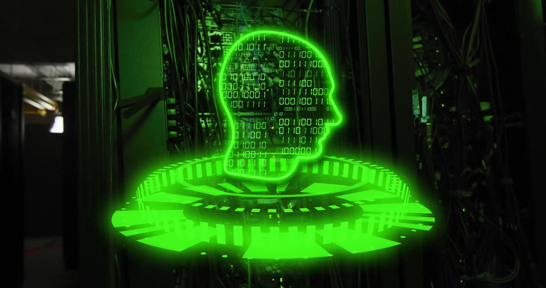 Holographic human head with binary code overlay set in a server room emphasizes concepts of modern technology and innovation. Vibrant green hue signifies advancement and artificial intelligence. Useful for visuals in technology marketing, cybersecurity posters, and articles focusing on digital innovations or IT infrastructure topics.