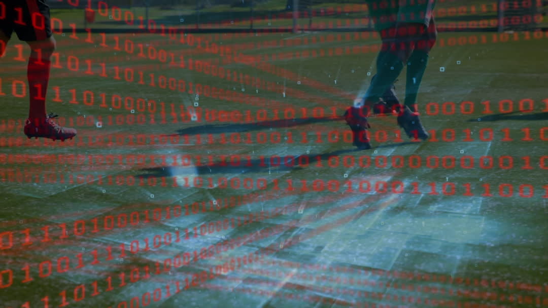 Digital binary code is superimposed over athletes engaged in football action on a green stadium field. Highlights the fusion of technology with sports, suggesting themes like performance analytics, virtual training, and modern sports management. Useful for presentations on innovation in athletics, multimedia on digitalization in sport, and articles discussing sports tech advancements.