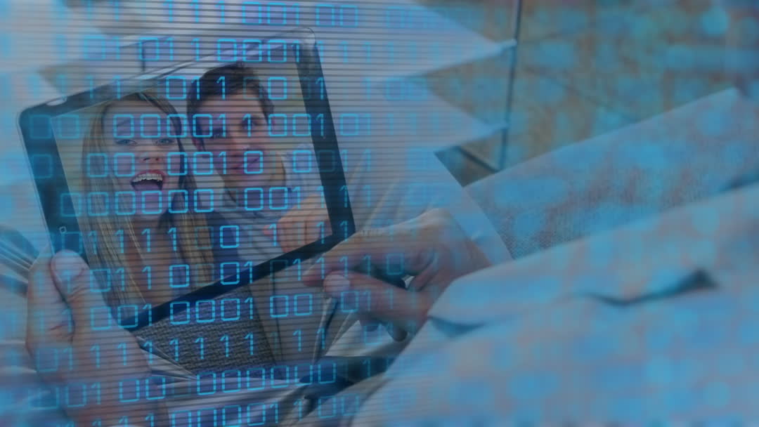 - Binary Code Overlay on Happy Couple Video Calling on Tablet