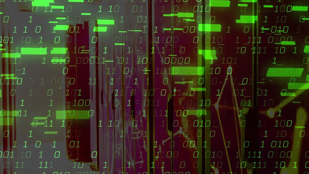 - Binary Code Overlay on Server Racks Signifying Data Flow