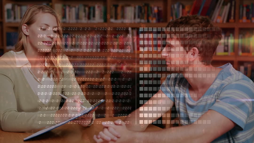 - Binary Code Overlay Teacher Student Session in Library Setting