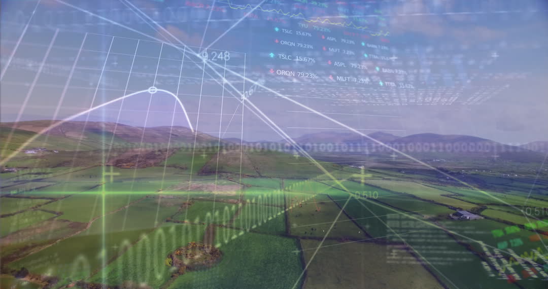 Combine modern technology with natural beauty depicting convergence of digital and natural worlds. Ideal for illustrating articles on technology in agriculture, data analytics in environmental studies, with focus on visualizing abstract concepts like digital transformation in rural settings.