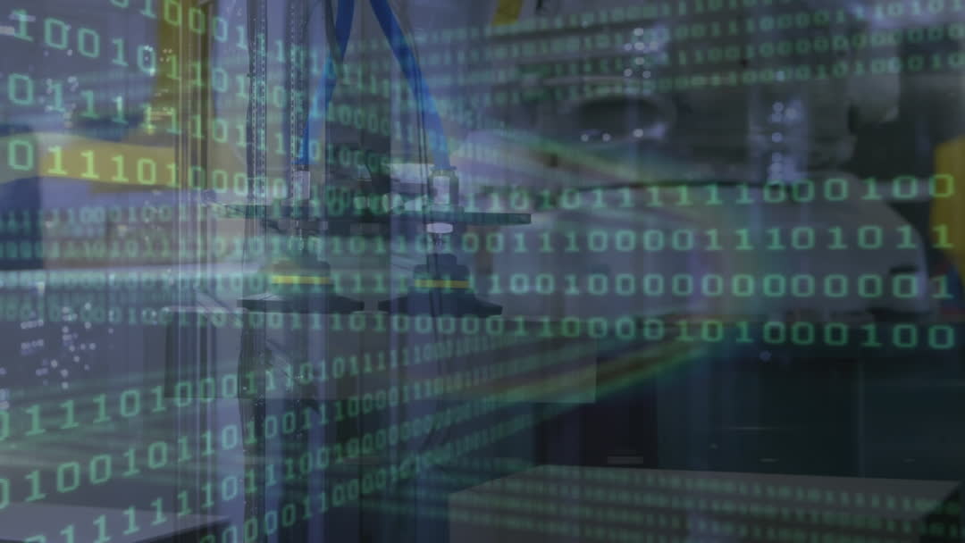 Binary Data Overlay on Factory Machinery Depicting Technology Video